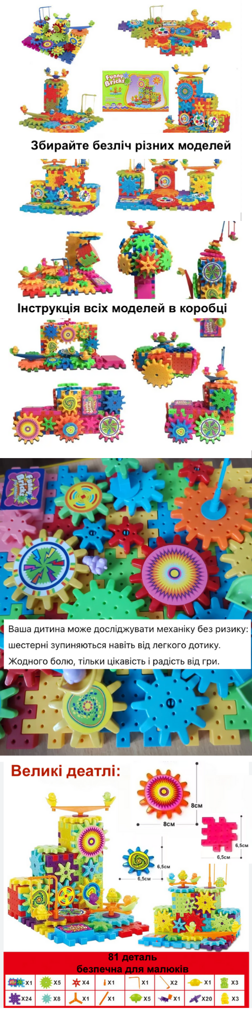 Дитячий 3D-конструктор Funny Bricks — це унікальний розвиваючий набір для дітей віком від 3 до 10 років, який поєднує пазли, креативність і справжню механіку. Малюк зможе створювати десятки різних композицій, поєднуючи блоки та шестерні, які оживають під час роботи механізму.